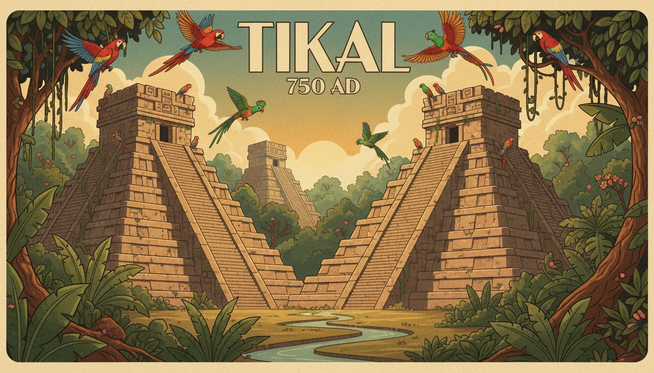 You step off the sacbe - the raised white limestone road - and there it is. Temple I punches through the jungle canopy like a stone fist, its roof comb blazing red and cream against an impossibly green sky. Howler monkeys scream from the treetops. The air is thick, wet, and smells like copal incense and earth. Welcome to Tikal, roughly 750 AD, the beating heart of Classic Maya civilization and home to maybe 60,000 people spread across the surrounding jungle.