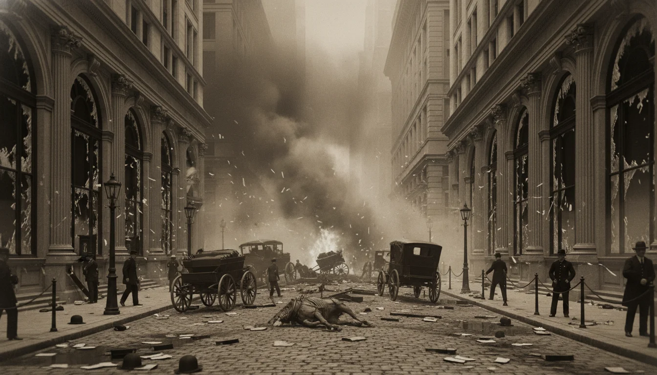 The blast ripped through the heart of American capitalism with a force that shattered windows for blocks and sent five hundred pounds of cast-iron sash weights tearing through the lunchtime crowd like shrapnel. The horse was vaporized. The wagon disintegrated. And thirty people died where they stood, their bodies scattered across the cobblestones in front of the most powerful bank on Earth.